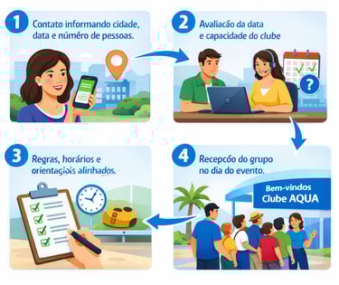 O Clube AQUA recebe grupos de diferentes perfis, com estrutura preparada para receber grandes volumes de pessoas de forma organizada e segura. Esse alinhamento prévio garante organização, segurança e uma experiência tranquila para todo o grupo.