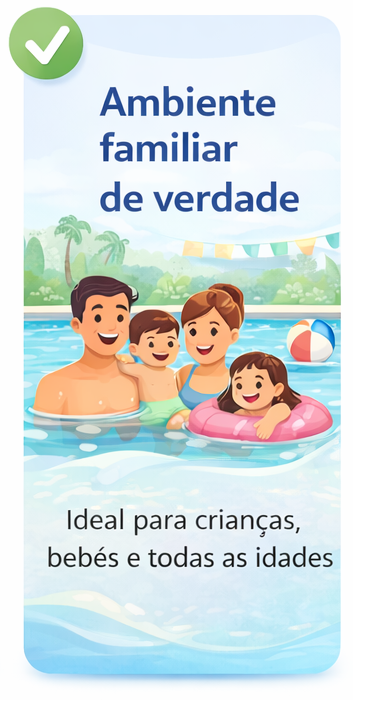 Aqui, crianças, bebês, jovens, adultos e idosos encontram lazer, natação e hidroginástica em um ambiente seguro, acolhedor e feito para a família.