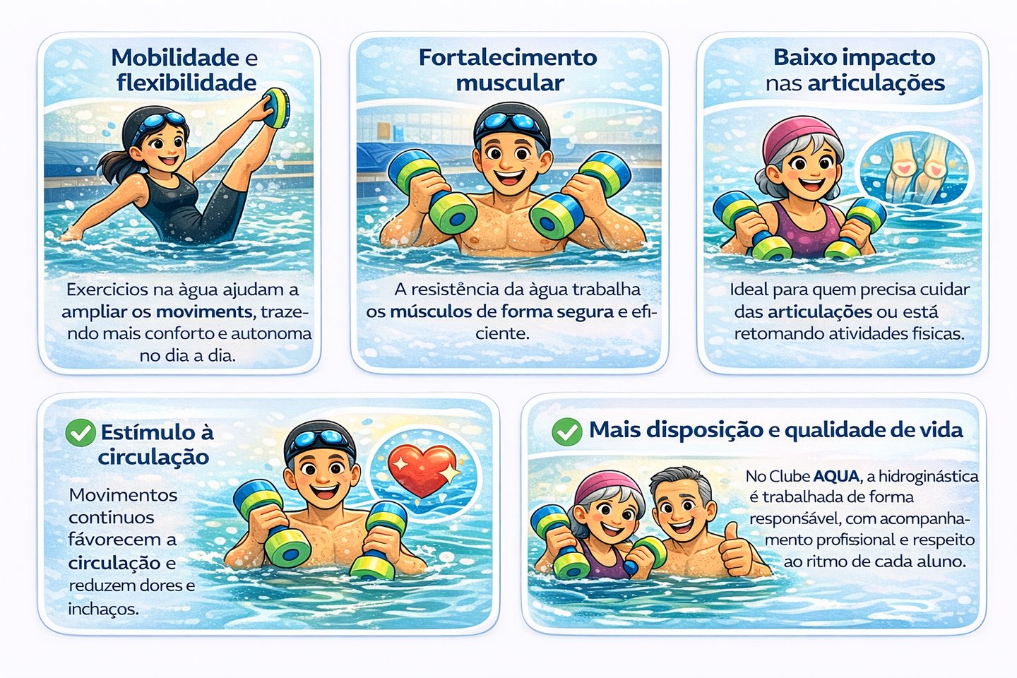 As aulas de hidroginástica no Clube AQUA acontecem durante todo o ano, em ambiente controlado, com acompanhamento profissional e foco na segurança e no bem-estar dos alunos.