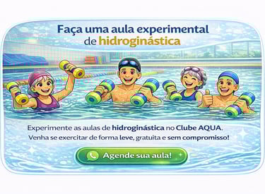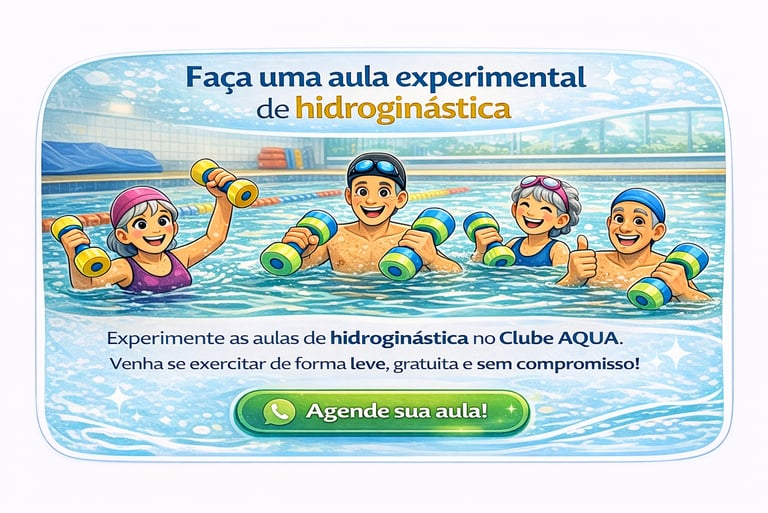 Conheça na prática como funcionam as aulas de hidroginástica do Clube AQUA. A aula experimental é gratuita e permite conhecer a estrutura, as piscinas cobertas e aquecidas e o ambiente do clube, sem compromisso.